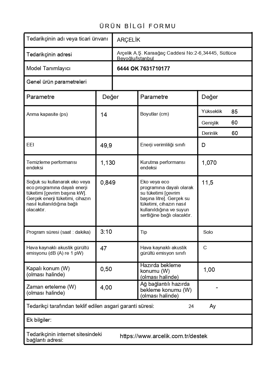 - Arçelik 6444 Ok D Enerji Sınıfı 4 Programlı Bulaşık Makinesi