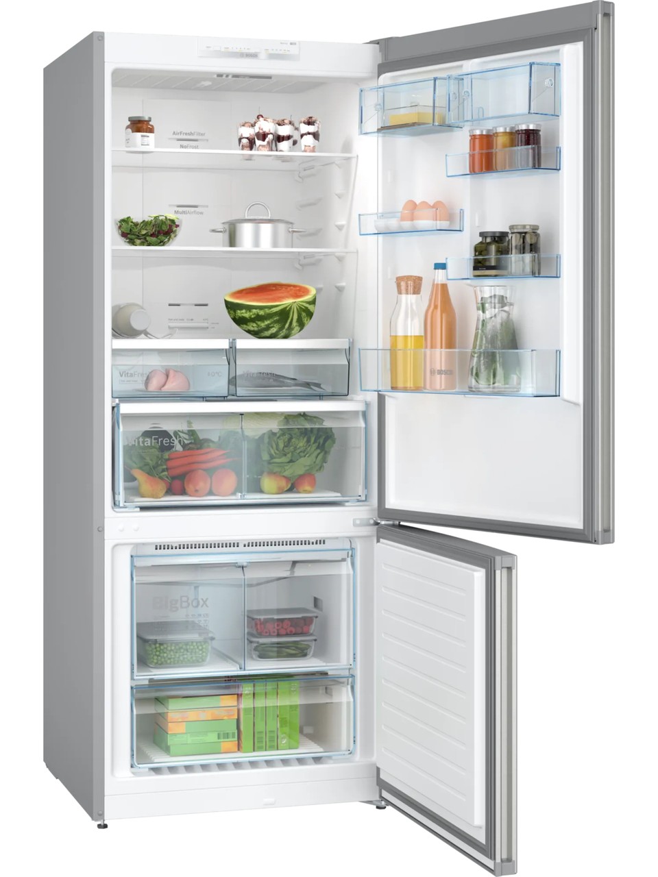 XL kapasiteli buzdolabı, yiyecek ve içecekleriniz için geniş alan imkanı sağlar. XL Kapasiteli Buzdolabı. >Bosch XL kapasiteli buzdolapları büyük aileler ve haftalık market alışverişi yapanlar için geniş depolama alanı sunar. Her türlü gıda ürünü ve hatta büyük tencereler için dahi yeterli alana sahip buzdolapları aynı zamanda mutfağınıza da mükemmel şekilde uyum sağlarlar. Eğer misafir ağırlamayı ve kalabalık sofraları seviyorsanız, XL kapasiteli buzdolapları tam size göre! Uzun yıllar boyunca sorunsuz çalışan LED aydınlatma buzdolabının içinde homojen bir aydınlatma sağlar ve parlama yapmaz. Buzdolabınızın içindekileri rahatça görebilmeniz için ideal parlaklık Tasarım ve enerji verimliliğinin başarılı kombinasyonuna parlak bir örnek; buzdolabı içindeki LED ışıklı panel. Optimal yerleşimi sayesinde iç bölümü çok iyi aydınlatır ve çok az enerji tüketir. Ayrıca uzun yıllar boyunca sorunsuz çalışır. VarioZone: İhtiyaca göre düzenlenebilen raflar ve çekmeceler sayesinde daha fazla esneklik. Dondurucu alanında tam esneklik VarioZone ihtiyaca göre düzenlenebilen raflar ve çekmeceler sayesinde dondurucu alanında büyük bir esneklik sağlar. Daha fazla alan oluşturmak için derin dondurucu bölmesindeki rafları kolayca kaldırabilirsiniz. Böylece çok katlı bir kek ya da bütün bir hindiyi kolayca muhafaza edersiniz. BigBox: Dondurulmuş büyük gıdalarınız için ekstra alan. Daha geniş saklama alanı BigBox size çok geniş hacimli bir alan sunar. Bu sayede örneğin büyük bütün bir hindiyi veya uzun bir kuzu kolunu saklayabilirsiniz. Üstelik BigBox bölmesinin üst çekmecesini ve aradaki cam rafı kaldırabilir ve böylece daha uzun yiyeceklere yer açabilirsiniz. VarioZone özelliği sayesinde dondurucu bölmesindeki tüm çekmeceler kolayca çıkarılabilir ve böylece gerektiğinde daha fazla alan kazanılır. Bu alanda isterseniz 3 katlı kocaman bir doğumgünü pastasını saklayabilirsiniz. VarioZone size geniş ve esnek bir dondurucu alanı sunar. Çekilebilen cam raflar sayesinde buzdolabındaki her şeye rahatça ulaşılabilir, yiyecekler kolayca alınıp geri konulabilir.