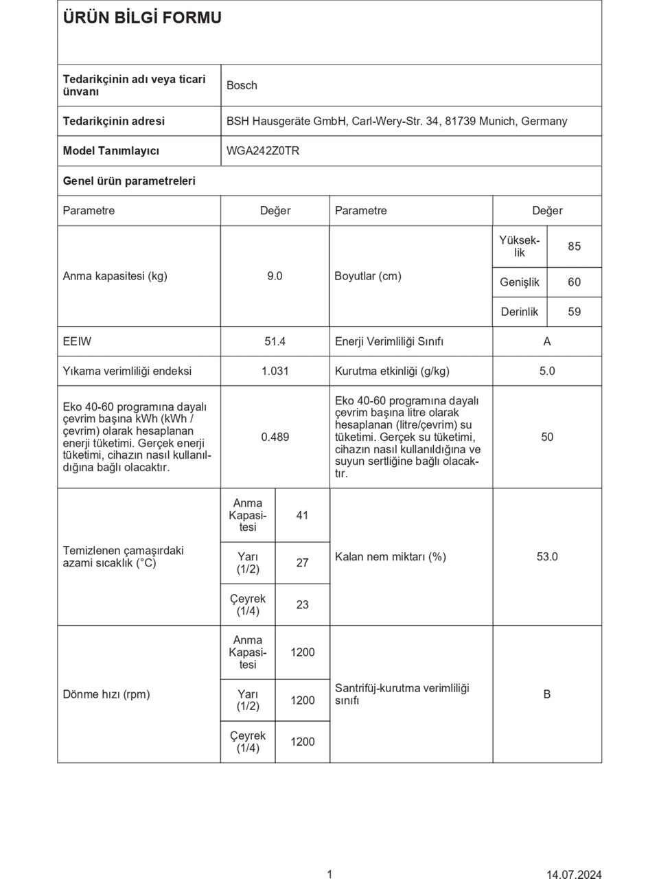 - Bosch WGA242Z0TR A Enerji Sınıfı 9 kg 1200 Devir Çamaşır Makinesi