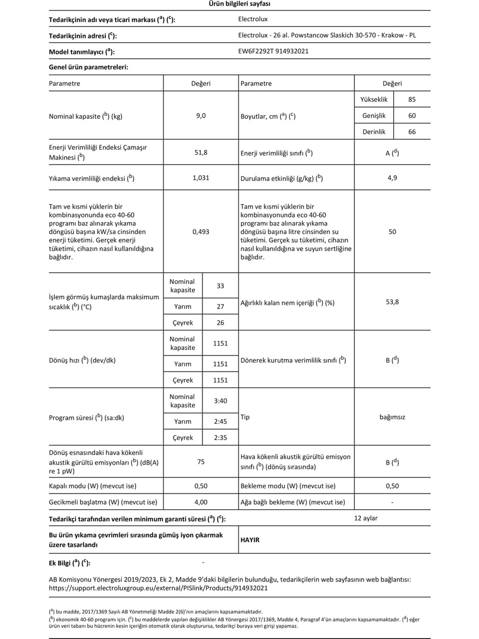 - Electrolux EW6F2292T 9kg 1200 Devir A Enerji Sınıfı Çamaşır Makinesi