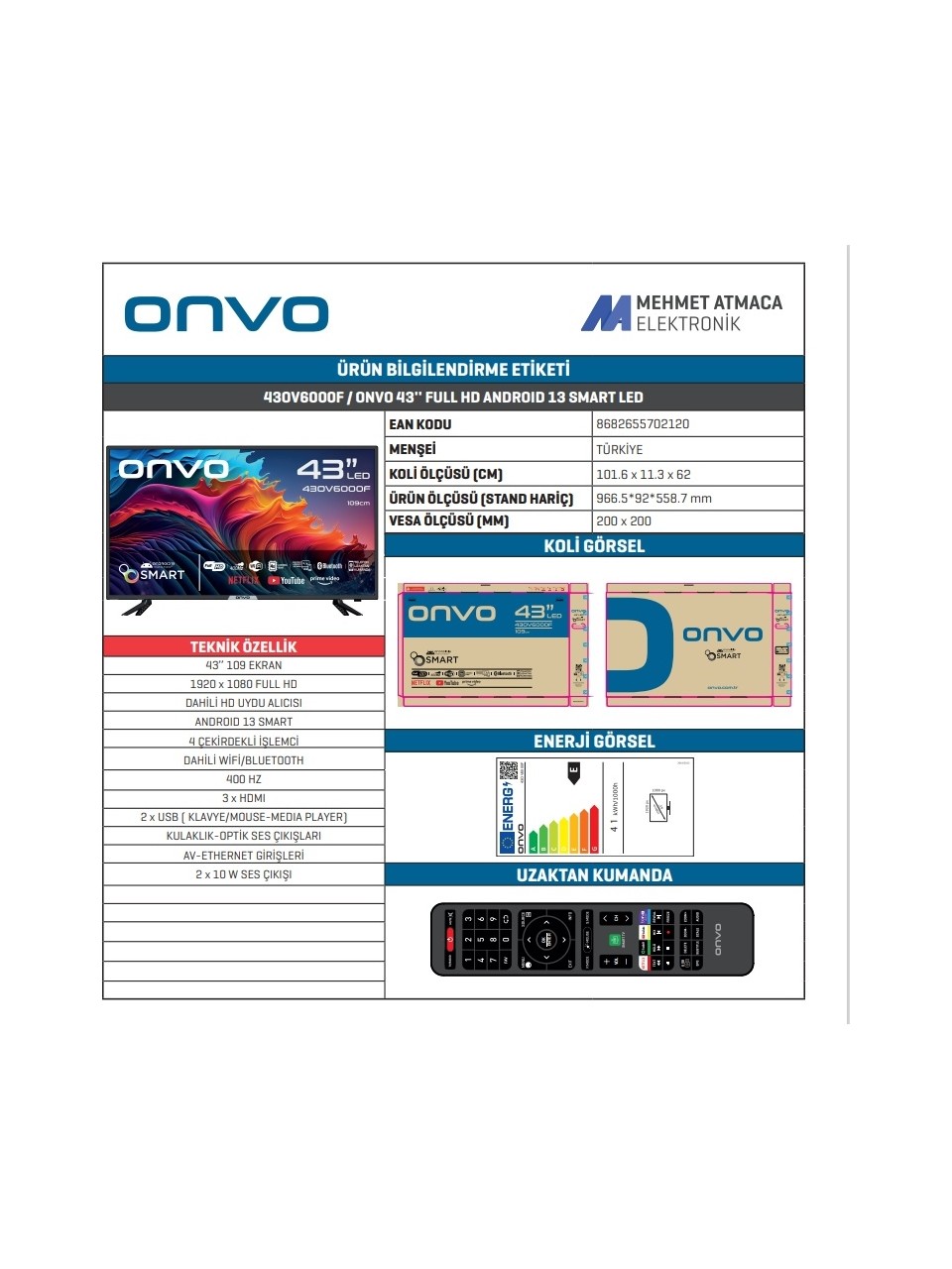 ONVO 43OV6000F 43" 109 Ekran Uydu Alıcılı FULL HD ANDROID SMART LED TV