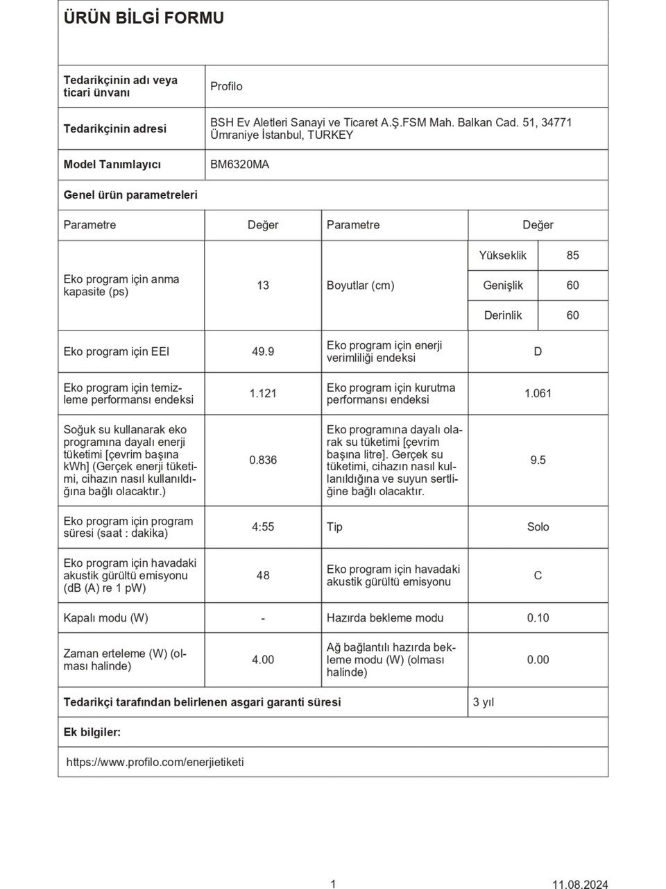 - Profilo BM6320MA D Enerji Sınıfı 6 Programlı Bulaşık Makinesi