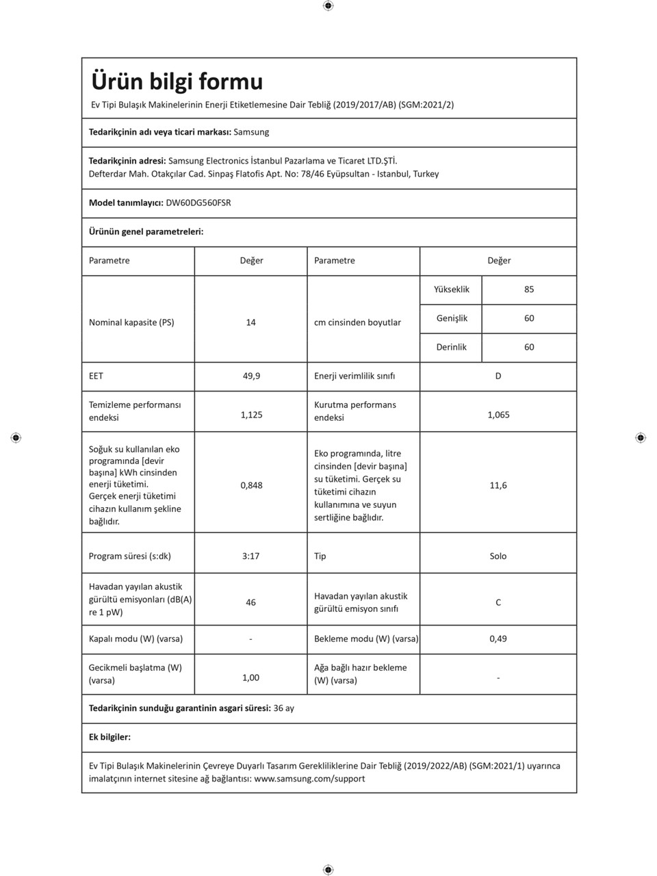 - Samsung DW60DG560FSRTR 6 Programlı Bulaşık Makinesi, D Enerji Sınıfı