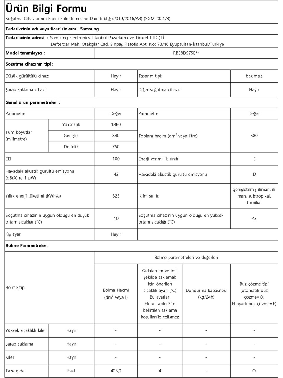 | Soğutucu (Litre) | 403 l |