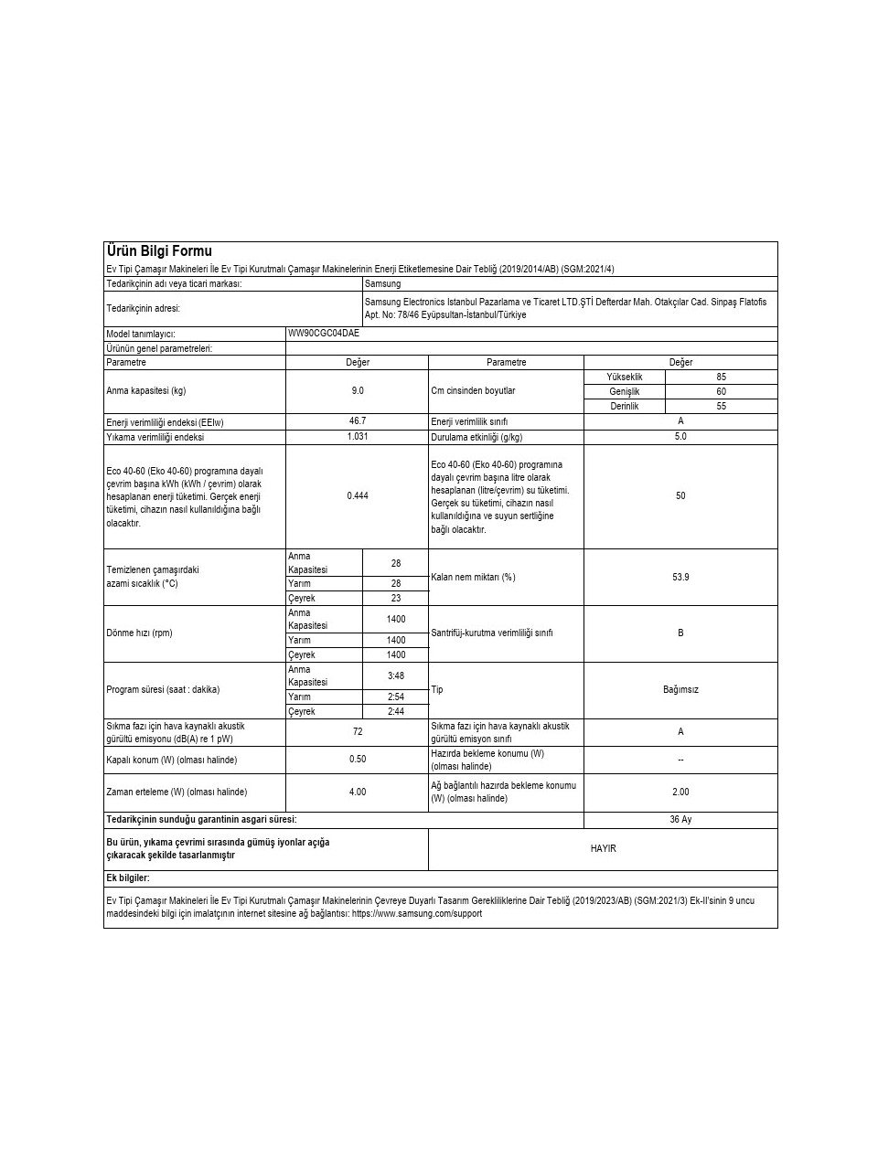 - Samsung WW90CGC04DAEAH 9 Kg 1400 devir Çamaşır Makinesi, Dahili Wi-Fi, Eco Bubble Yıkama Teknolojisi