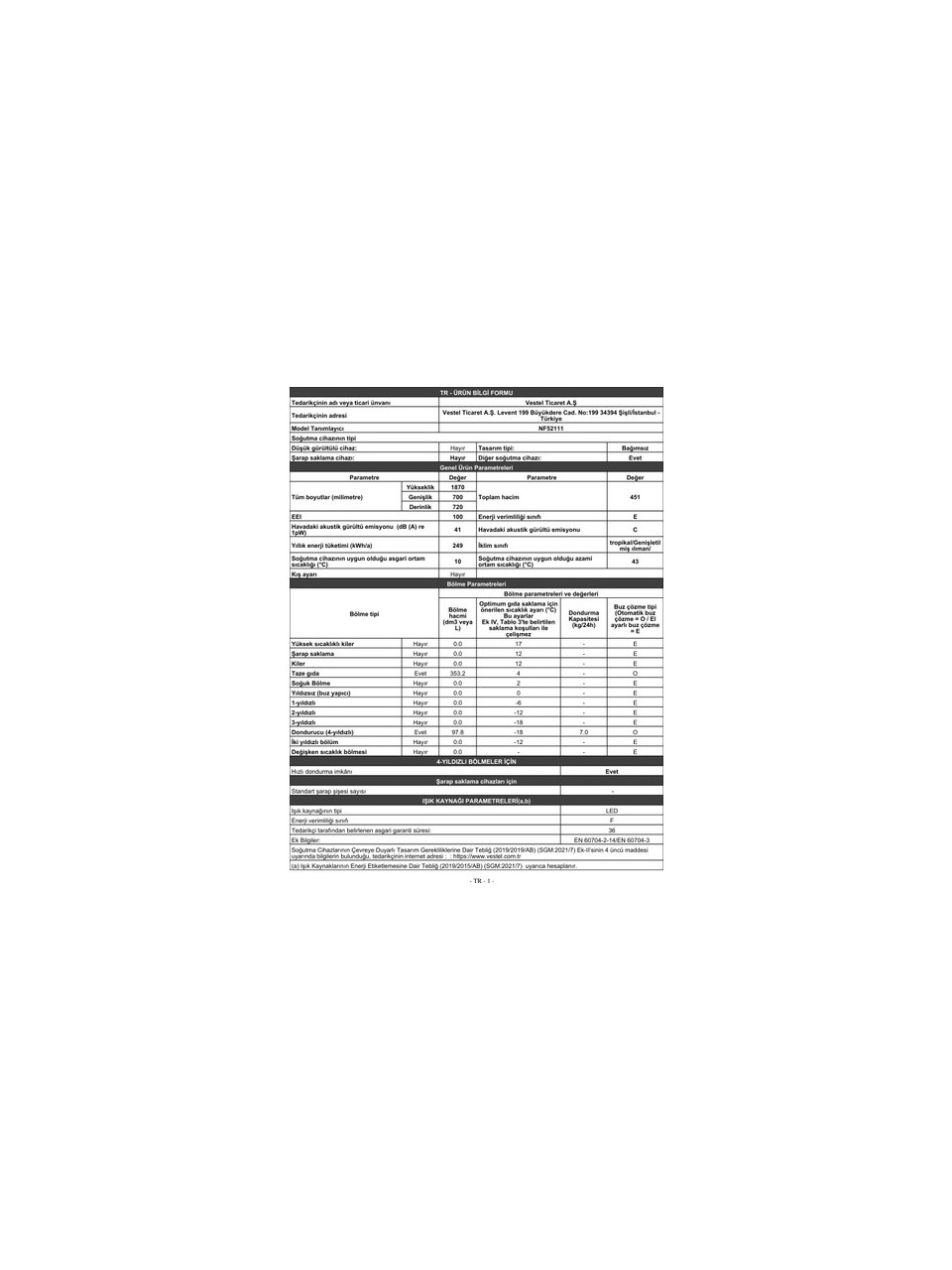Vestel NF52111 451 Lt E Enerji Sınıfı No-Frost Buzdolabı