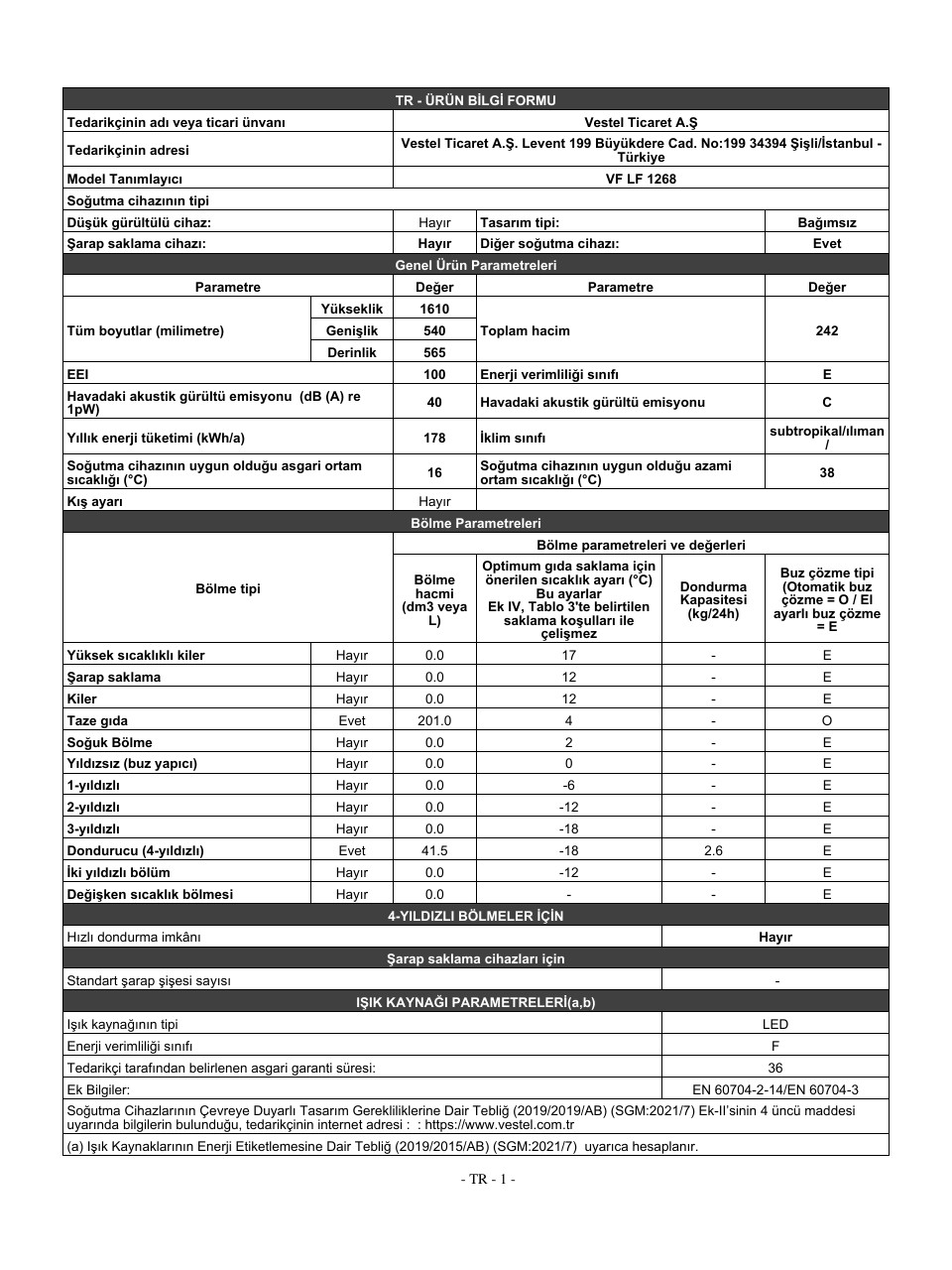 Vestfrost VF LF 1268 242 Lt Statik Buzdolabı